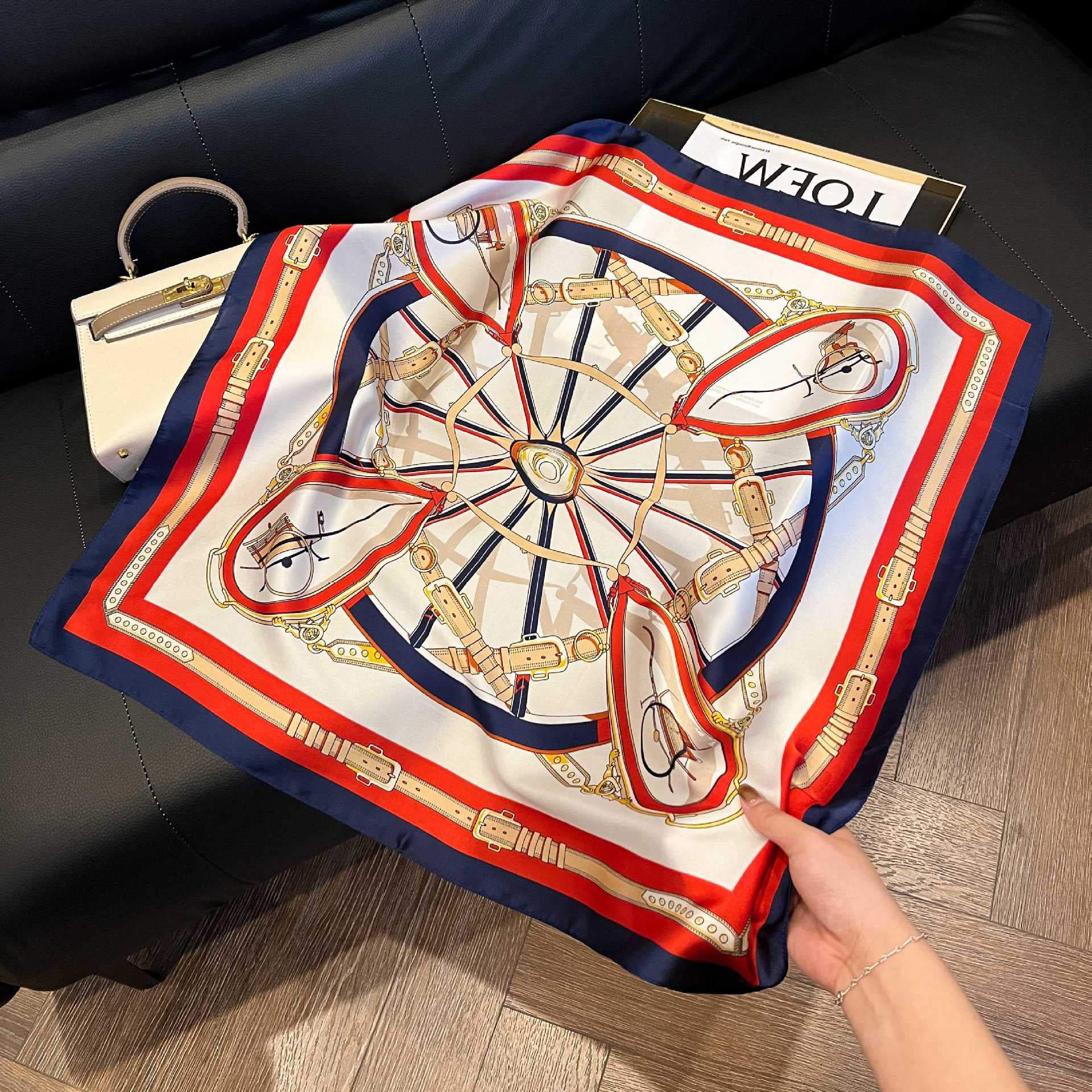 Un foulard qui évoque la noblesse et l’énergie, avec ses teintes rouge, bleu marine et or. Le motif de roue centrale entourée de boucles et de sangles rend hommage à l’univers équestre et aux carrosses traditionnels.